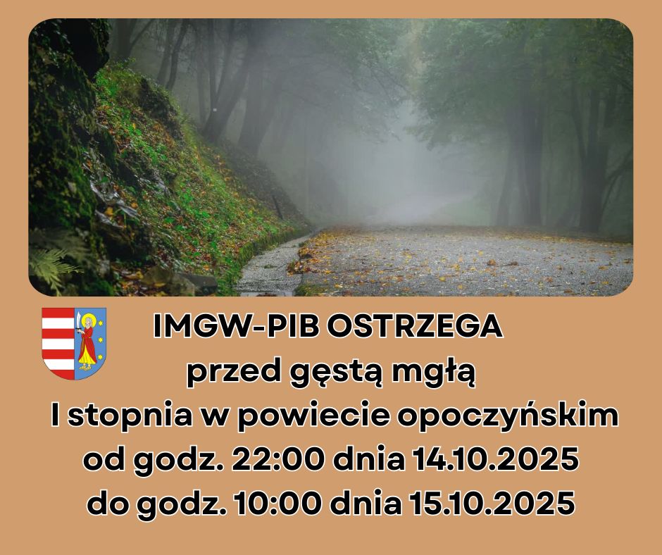 IMGW-PIB Centralne Biuro Prognoz Meteorologicznych – Wydział w Warszawie wydało ostrzeżenie I stopnia przed gęstą mgłą ograniczającą widzialnośc poniżej 200m. od godziny 22:00 dnia 14.10.2025 do godziny 10:00 dnia 15.10.2025 dla województwa łódzkiego w tym powiatu opoczyńskiego.