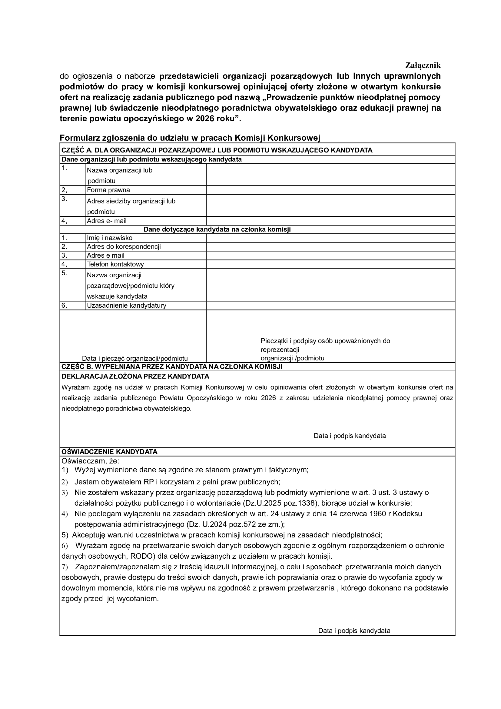 Ogłoszenie Zarządu Powiatu Opoczyńskiego z dnia 21 października 2025 r. naborze przedstawicieli organizacji pozarządowych oraz innych uprawnionych podmiotów do pracy w komisji konkursowej opiniującej oferty złożone w otwartym konkursie ofert