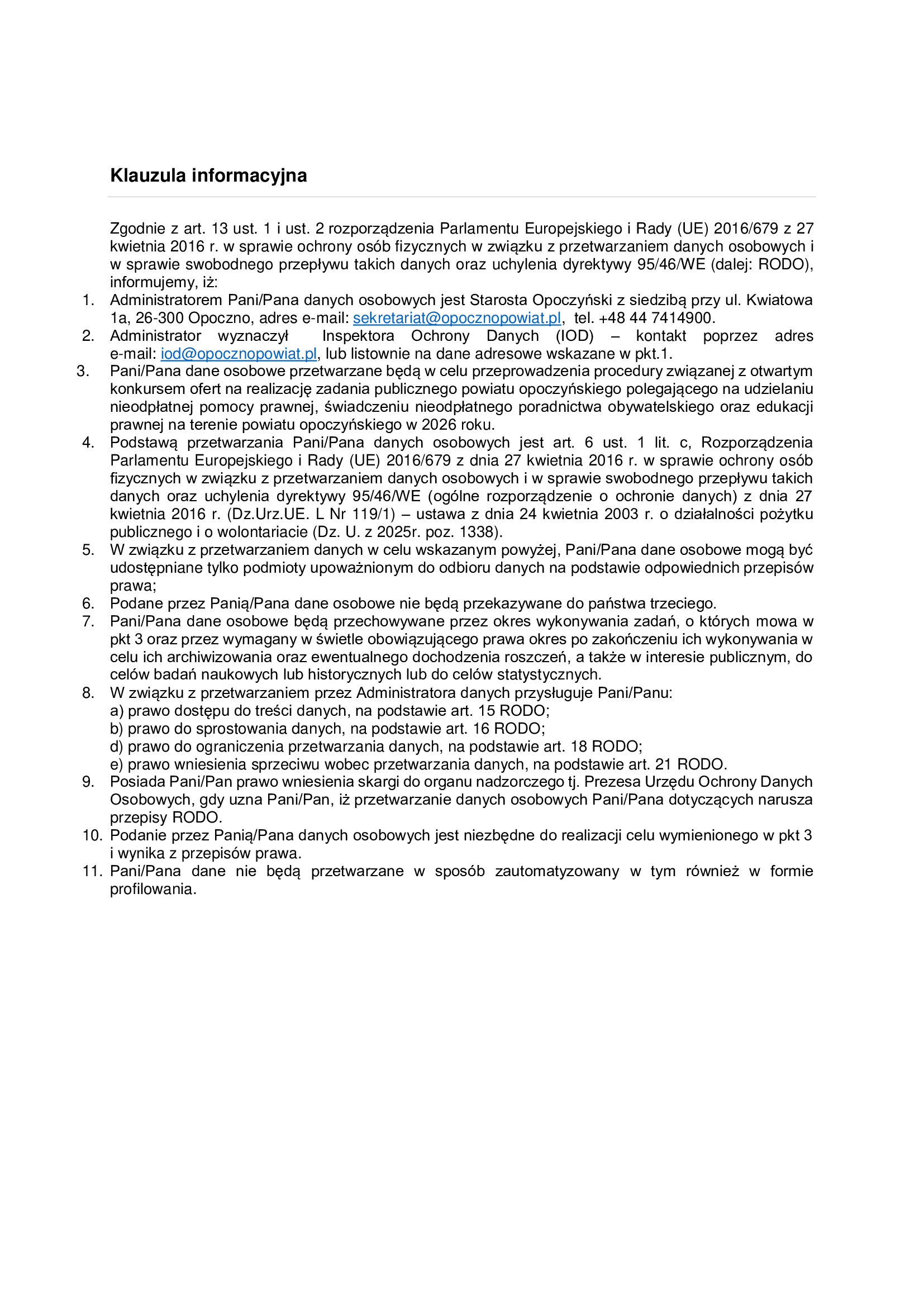 INFORMACJA DOTYCZĄCA ZMIANY TERMINU DYŻURU NIEODPŁATNEJ POMOCY PRAWNEJ PRZYPADAJĄCEGO W DNIU 2 STYCZNIA 2026 ROKU W STAROSTWIE POWIATOWYM W OPOCZNIE