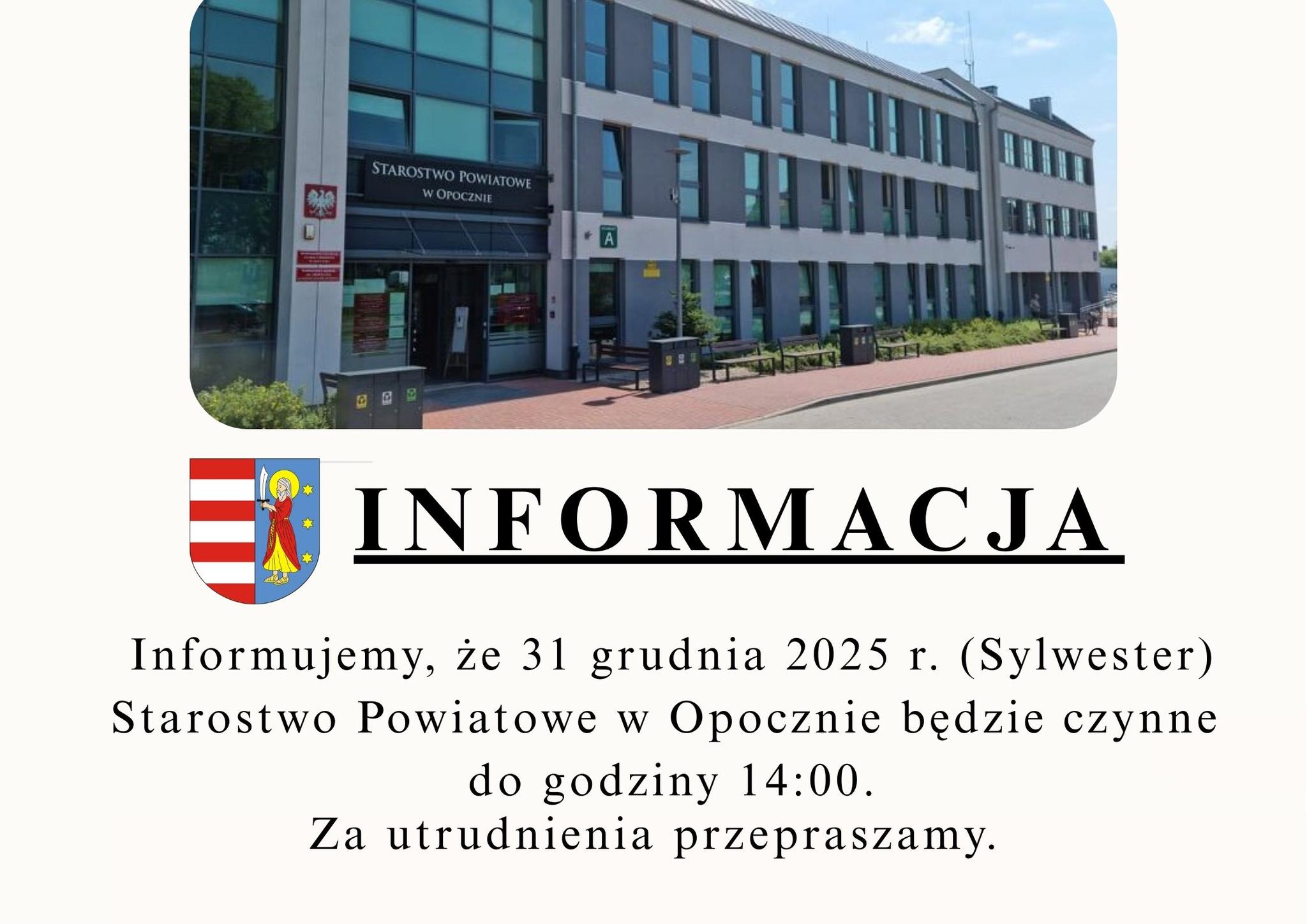Zmiana godzin pracy Starostwa Powiatowego w Opocznie w dniu 31.12.2025 r.(SYLWESTER)
