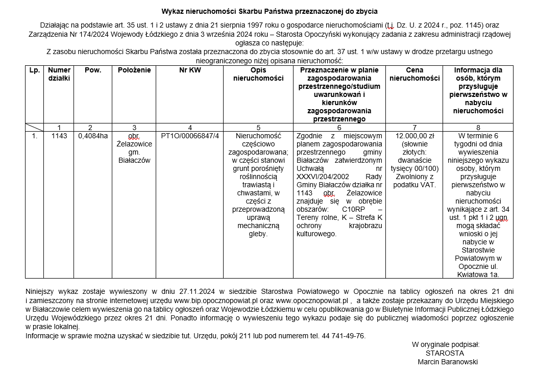 Wykaz nieruchomości Skarbu Państwa przeznaczonej do zbycia