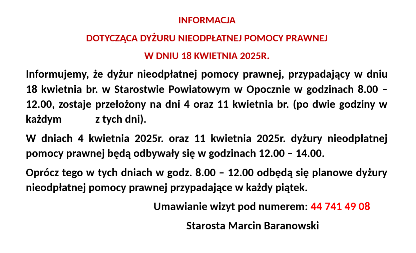 INFORMACJA DOTYCZĄCA ZMIANY TERMINU DYŻURU NIEODPŁATNEJ POMOCY PRAWNEJ PRZYPADAJĄCEGO W DNIU 2 STYCZNIA 2026 ROKU W STAROSTWIE POWIATOWYM W OPOCZNIE