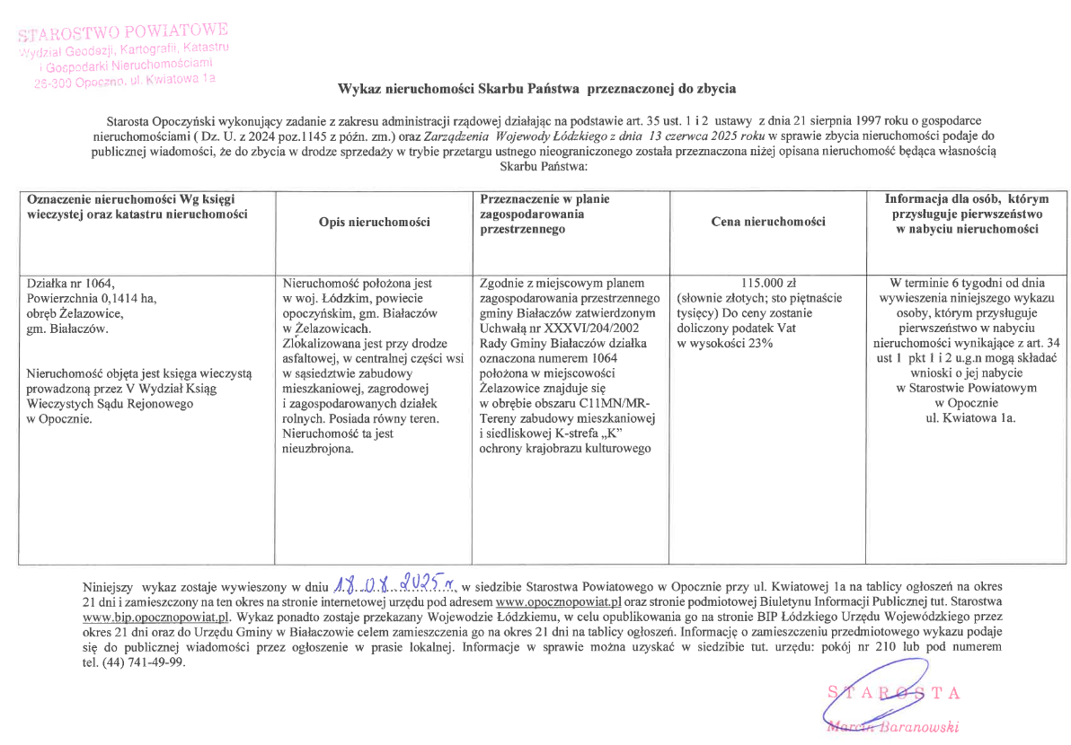 Wykaz nieruchomości Skarbu Państwa przeznaczonej do zbycia w drodze sprzedaży tj. działki nr 1064 położonej w Żelazowicach w gm. Białaczów