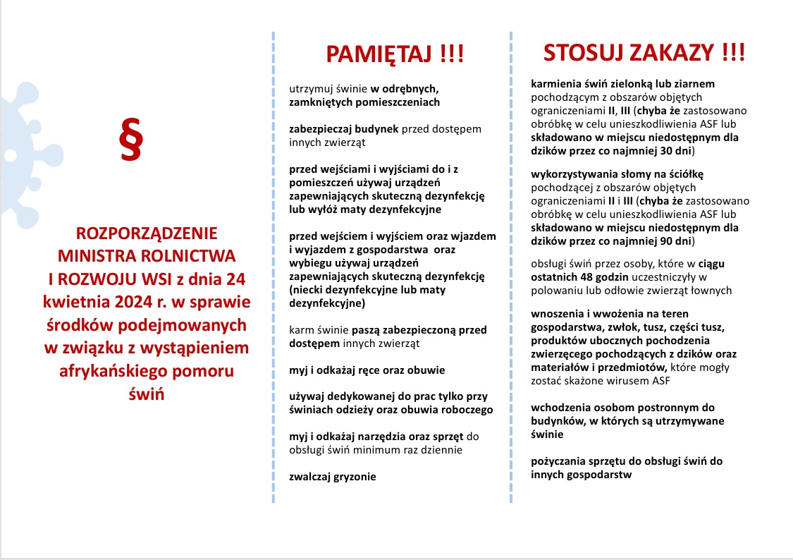 Rozporządzenie Ministra Rolnictwa i Rozwoju Wsi z dnia 24 kwietnia 2024 r. w sprawie środków podejmowanych w związku z wystąpieniem afrykańskiego pomoru świń.