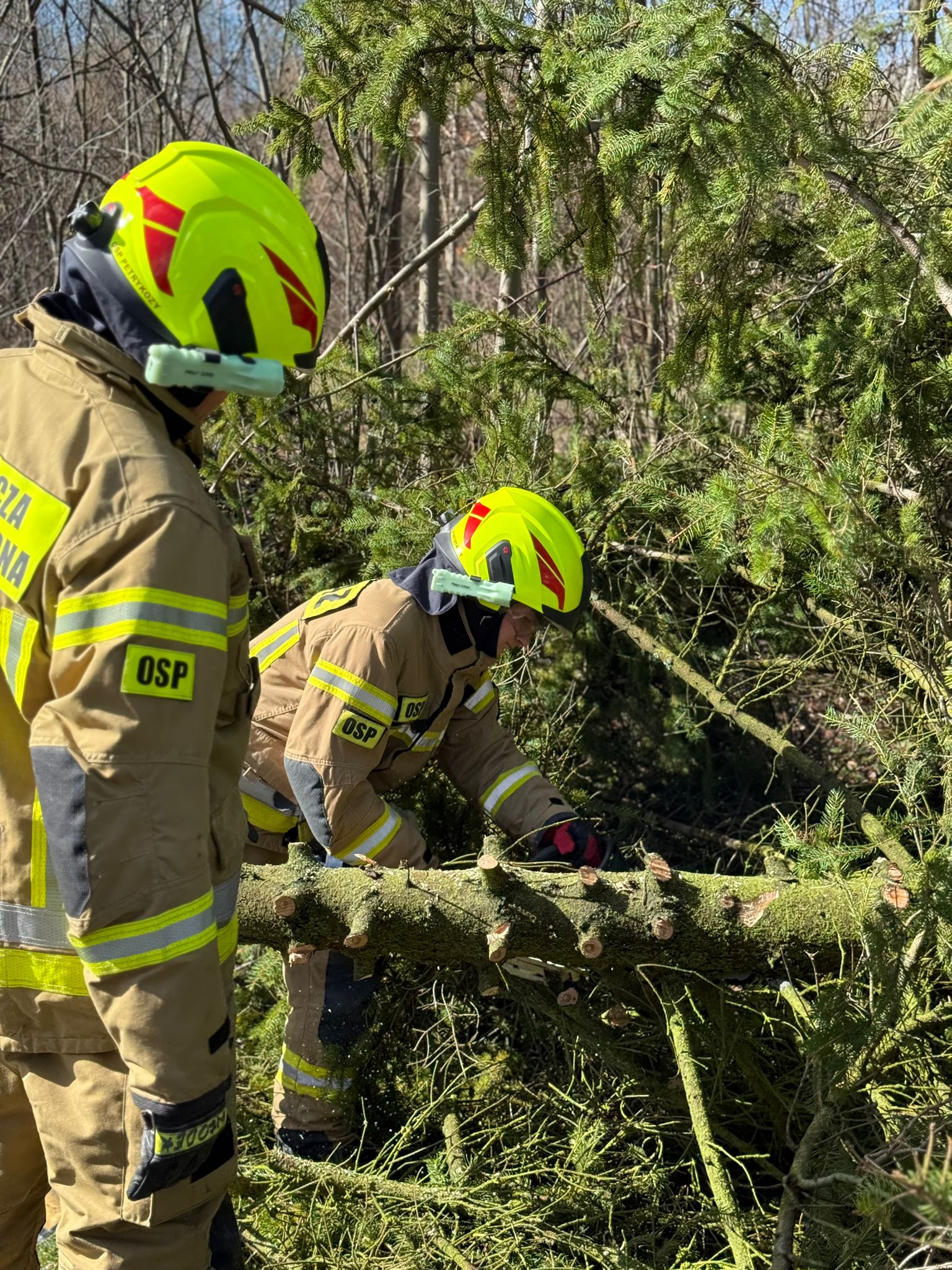 Dwa zastępy OSP zostały zadysponowane do usunięcia powalonych dwóch drzew z jezdni drogi gminnej w miejscowości Mroczków Gościny gm. Opoczno. Działania zastępów JOP polegały na zabezpieczeniu miejsca zdarzenia oraz usunięciu drzew z drogi.