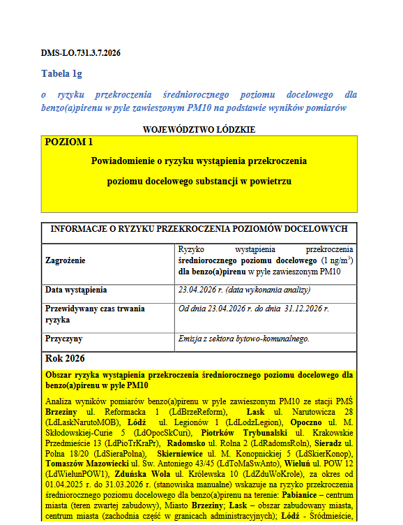 Ryzyko przekroczenia średniorocznego poziomu docelowego dla benzo(a)pirenu w pyle zawieszonym PM10 na podstawie wyników pomiarów